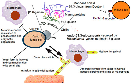 Components of the cell wall that help fungi to evade the immune system. The outer layer of mannans of many fungal cells shields the highly immunogenic β-1,3-glucan from Dectin-1 receptor, precluding the activation of effector mechanisms in immune cells. In the case of Histoplasma cells, endo- β-1,3-glucanase is released to trim β-1,3-glucans from the cell and prevents its recognition via Dectin-1 receptor. Melanin is distributed into the cell wall of some fungal pathogens and contributes to resistance to phagocytosis and enzymatic degradation by macrophages. Finally, the reversible, dimorphic switch between yeast and hyphae confers special traits to each form that helps the pathogen to disseminate and invade the host.