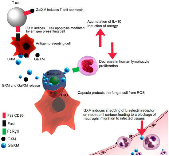 Both GXM and GalXM can induce apoptosis in different cells [74]. Accumulation of GXM in macrophages leads to induction of FasL, promoting apoptosis in T cells that express Fas [75]. Moreover, GalXM binds directly to galectins and induces apoptosis of T cells, via caspase 8 activation and the consequent DNA fragmentation (Figure 2) [75,76].