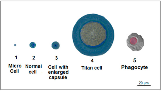 C. neoformans does not form hyphae during infection but possesses other unique mechanisms that influence its virulence. As previously described, it has a capsule and its shape and size can be modulated for its benefit. Furthermore, C. neoformans can also modulate the size of the cell body. It has been described that the cell body can enlarge during an amoeba and macrophage challenge, indicating that size enlargement is a protective mechanism [81,82]. These cells are extremely oversized, ranging from 14- to 20-fold the size of typical yeasts grown in vitro (Figure 3 and Table 2). [83]. A mutant that overproduces titan cells is unable to be cleared from the lungs [84], suggesting that titan cells are a special morphology that enhances C. neoformans virulence and may be involved in latent infections that persist for several years in some humans infected with C. neoformans [85,86]. Titan cells are unable to be phagocytized and disseminated to the brain, but, intriguingly, they promote a 300-fold increase in the dissemination of normal size cells from lungs to the central nervous system, by a mechanism still unknown [84]. There is evidence indicating that titan cells produce daughter cells that have a normal size [59], and are resistant to oxidative and nitrosative stresses, suggesting that proliferation may be increased through a normal-size progeny that is capable of surviving inside the phagocyte and results in intracellular dissemination being easier [59,60].
