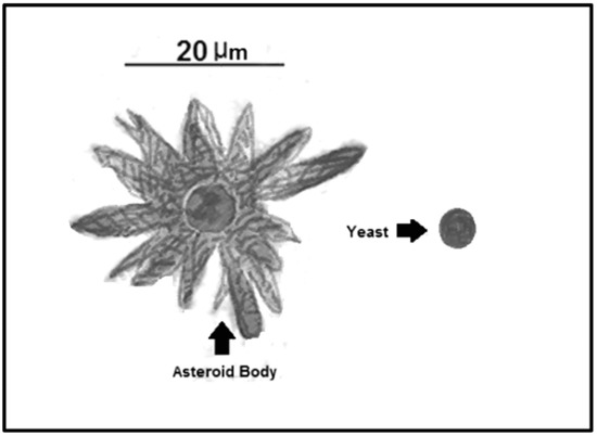 Asteroid bodies (AB) have been described in multiple fungi that are responsible for deep-seated mycosis, such as Sporothrix, Lacazia, Candida, Histoplasma, Paracoccidioides, and Aspergillus [61]. AB have been widely described in Sporothrix schenckii, which are found in 90% of granuloma cases associated with sporotrichosis [61]. These bodies are described as concentric layers and spikes formed around a central yeast, after a process of crystallization mediated by calcium salts and subsequent precipitation, resulting in a visible crown-like structure surrounding the yeast, which is round and different from those observed inside macrophages (smaller and cigar-shaped) [61]. Fungal molecules are not the unique components of AB; they can contain multiple host components of the immune system, such as debris from polymorphic nuclear cells and precipitated antigen–antibody complexes [87,88,89]. The AB protect the central yeast from the environment and portions of IgGs and IgMs are trapped in the external crown, suggesting an interference with the immune system. All these data support the idea that AB may act as a resistance structure, because the central yeast inside the crown is viable and capable of dividing inside the crown in vivo and in vitro conditions, forming filaments to break down the structure [61] (Figure 4 and Table 2).