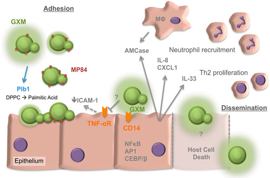 Overview of Cryptococcus interactions with the respiratory epithelia. Factors involved in both adhesion and later dissemination are depicted. GXM, glucuronoxylomannan. MP84, Mannoprotein 84. Plb1, phospholipase 1. DPPC, dipalmitoyl phosphatidylcholine. ICAM-1, intercellular adhesion molecule-1. TNF-αR, tumor necrosis factor-alpha receptor. AMCase, acidic mammalian chitinase. IL, interleukin. CD, cluster of differentiation. CXCL1, chemokine (C-X-C motif) ligand 1. Th2, T-helper 2 cell. MΦ, macrophage. NF-κB, nuclear factor kappa-light-chain-enhancer of activated B cells. AP1, Activator protein 1. CEBP/β, CAAT/ enhancer-binding protein β. T arrows, blocking of response. Solid arrows, secretion or inducing action. Dashed arrows, uncertain if activity is direct or indirect. Dashed lines represent host cell death.