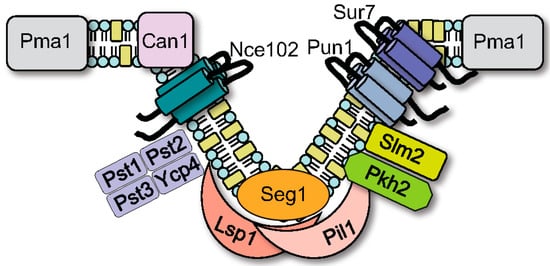 - Moreira, K.E.; Schuck, S.; Schrul, B.; Frohlich, F.; Moseley, J.B.; Walther, T.C.; Walter, P. Seg1 controls eisosome assembly and shape. J. Cell Biol. 2012, 198, 405–420. [Google Scholar] [CrossRef] [PubMed]