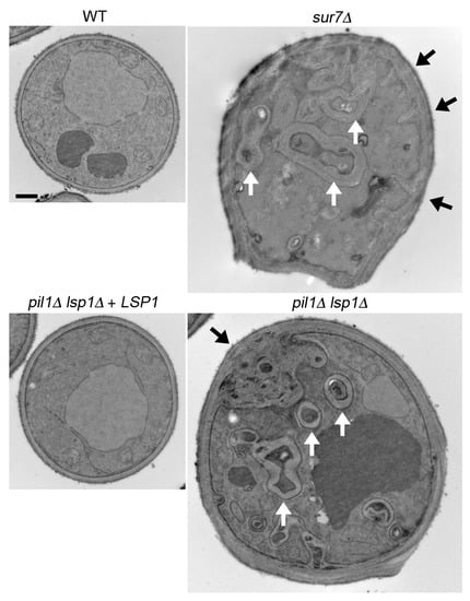 Abnormal cell wall invaginations in C. albicans sur7∆ and pil1∆ lsp1∆ mutants. The indicated cell sections were analyzed by transmission electron microscopy. Thicker cell walls and invaginations of cell wall material were detected in both the sur7∆ mutant and the pil1∆ lsp1∆ double mutant. The white arrows indicate tubes of cell wall material. Black arrows indicate spots where there are spiky invaginations in the sur7∆ mutant and the large round cell wall invagination in the pil1∆ lsp1∆ mutant. Black bar, 1 µm. This image was reproduced from Figure 2 of the paper by Wang et al. [].