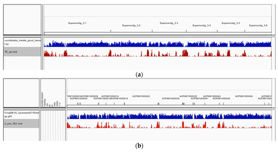 - Castanera, R.; López-Varas, L.; Borgognone, A.; LaButti, K.; Lapidus, A.; Schmutz, J.; Grimwood, J.; Pérez, G.; Pisabarro, A.G.; Grigoriev, I.V.; et al. Transposable Elements versus the Fungal Genome: Impact on Whole-Genome Architecture and Transcriptional Profiles. PLoS Genet. 2016, 12, e1006108. [Google Scholar] [CrossRef] [PubMed]
