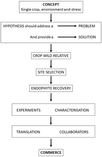 Many promising scientific discoveries do not make a successful transition to commerce, for any number of reasons, while some discoveries happen almost by accident [61]. The most common point of failure may be in the initial research project design, where a focused, achievable and outcome-based plan is not in place [62]. This is especially true of research into the potential of endophytes in agricultural crops, where many valuable discoveries languish in the limbo between the laboratory bench and the farmer’s field. In this paper, we have shown that a properly focused endophyte project with a continuous emphasis on one particular outcome can result in a more successful transition from idea to application. We have described a set of best practices leading to the development of a successful endophyte field crop inoculant, and this approach can, in principle, be adapted for any crop or agricultural environment (including marginal lands) provided that a similar methodology is followed. The flowchart (Figure 1) shows the basic steps and decision points of our approach.