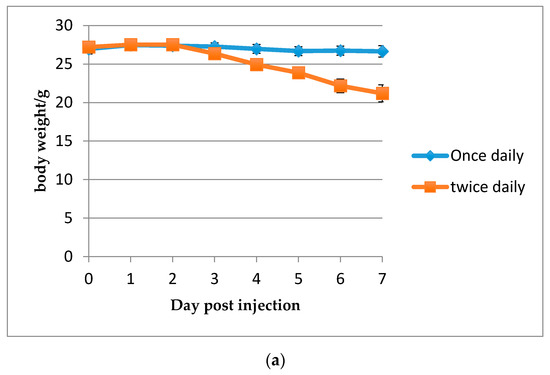Effect of 20 mg/kg Compound 6 on body weight using two dosing regimens. (a) Body weight loss in grams following dosing once or twice, 6 h apart, for four consecutive days. (b) Percent body weight loss following dosing once or twice, 6 h apart, for four consecutive days. Two groups of 8-week old Female Swiss CD.1 mice were injected SC with 20 mg/kg of Compound 6 (n = 8). Mice were weighed daily for 7 days. Each point indicates mean ± SEM.