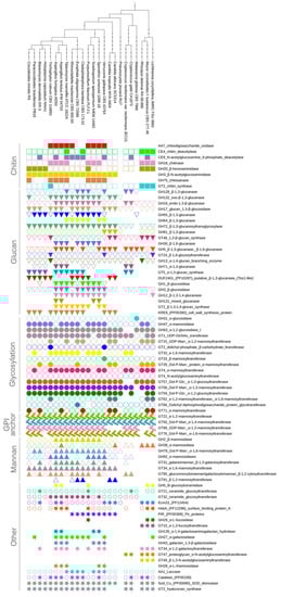Cryptococcus cell wall is unique in terms of its outer mucous layer (capsule) decorated with special compounds masking the immunogenic glucan inner layer [37]. The capsule is composed in 90% of glucuronoxylomannan (GXM) and galactoxylomannan (GalXM), with a minor fraction of mannoproteins [97]. Its CW, like one of the Aspergillus and dimorphic fungi, has a α-1,3-glucan fraction involved in association of capsule material with the cell surface [98]. Interestingly, Cryptococcus CW has more β-1,6-glucan than β-1,3-glucan. The overall CWP repertoire of Cryptococcus is relatively small and reduced as compared to filamentous ascomycetes, but it shows signs of high specialization, with additional enzymes apart from the classical core machinery (involved in chitin and glucan metabolism) for synthesis of hyaluronic acid (GT2), glucuronoxylomannan (GXM), and galactoxylomannan (GalXM) (GT90). Two analyzed Cryptococcus species lack several glycosylation enzymes, e.g., α-mannosyltransferases (GH62), Dol-P-Glc: α-1,3-glucosyltransferases (GT57), α-1,2-glucosidase I (GH63), and glucan-related mixed glucanase (GH131, GH12), mixed glucan synthase CelA (GT2), β-glucosidase (GH1), β-1,3-glucanases (GH55, GH64), chitooligossacharide oxygenases (AA7), and chitinases (GH75). C. gattii has five SOD dismutases, as compared to only two in C. neoformans, which might contribute to C. gattii enhanced ROS resistance.