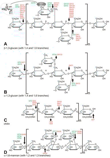 Major carbohydrate polymers which build fungal cell wall. (A) β-1,3-glucan (crosslinked via 1,4 and 1,6 chain branches); (B) α-1,3-glucan (crosslinked via 1,4 and 1,6 chain branches); (C) chitin; (D) mannan, mostly found in Saccharomycetales. Green font refers to anabolic enzymes (transferases), red font refers to catabolic enzymes (hydrolases). *—concerns chitosan only, ^—linkage via phosphodiester bond.