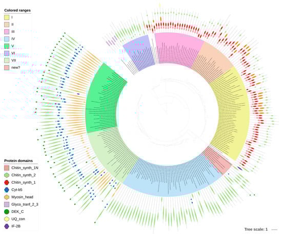 Phylogenetic tree of chitin synthases. The tree was built with PhyML (LG + G model with aLTR branch supports), the image was prepared with iTOL.