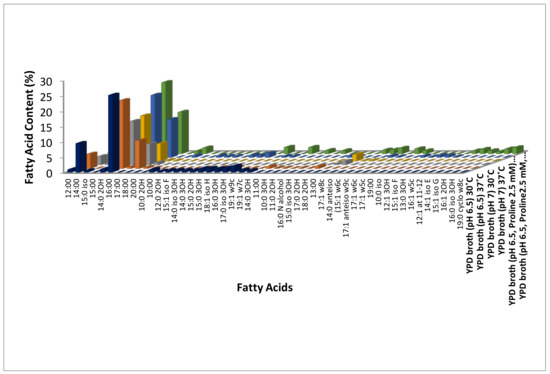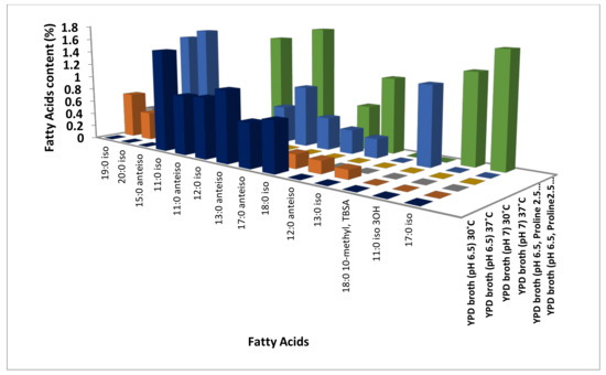 Modulation of methyl branched saturated fatty acids content in C. albicans response to different microenvironments (temperature, pH 7, and hydrostatic pressure).