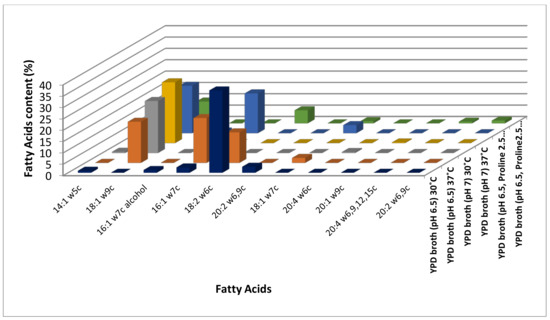 2.2. Effect of Physical Factors (pH, Temperature and Low Hydrostatic Pressure) on Fatty Acid Content in Candida albicans