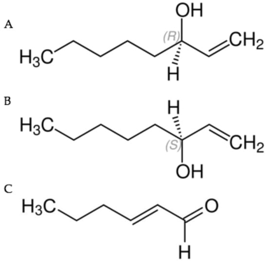 (A) (R)-(−)-1-octen-3-ol (R form); (B) (S)-(+)-1-octen-3-ol (S form); (C) trans-2-hexenal.