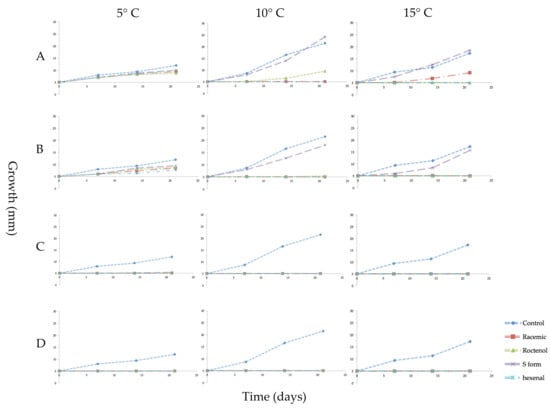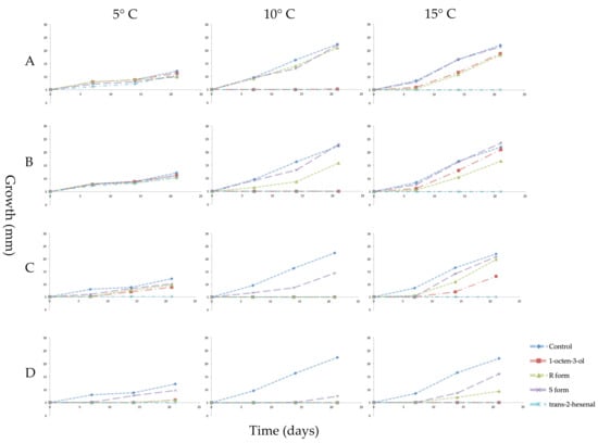 Growth in millimeters (mm) of mycelial plugs of Pseudogymnoascus destructans exposed for 3 weeks to vapors of racemic 1-octen-3-ol, (R)-(−)-1-octen-3-ol (R form), (S)-(+)-1-octen-3-ol (S form), or trans-2-hexenal and cultured at 5, 10 or 15 °C. Error bars indicate the standard error of the mean. VOC treatments as follows: (A) 0.04 µmol/mL of the three forms of 1-octen-3-ol or 0.05 µmol/mL of trans-2-hexenal; (B) 0.08 µmol/mL of 1-octen-3-ol or 0.1 µmol/mL trans-2-hexenal; (C) 0.4 µmol/mL 1-octen-3-ol or 0.5 µmol/mL trans-2-hexenal; (D) 0.8 µmol/mL 1-octen-3-ol or 1.0 µmol/mL trans-2-hexenal.