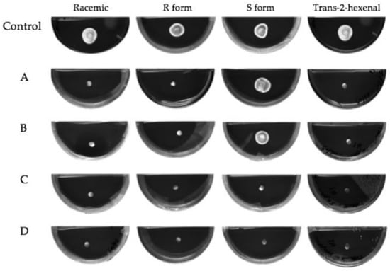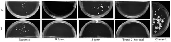 The effect of exposure to low concentrations of volatilized racemic 1-octen-3-ol, (R)-(−)-1-octen-3-ol (R form), (S)-(+)-1-octen-3-ol (S form) and trans-2-hexenal on growth of P. destructans conidiospores after 3 weeks of incubation at 10 °C. VOC treatments as follows: (A) 0.04 µmol/mL of three enantiomers of 1-octen-3-ol or 0.05 µmol/mL of trans-2-hexenal; (B) 0.08 µmol/mL of three enantiomers of 1-octen-3-ol or 0.1 µmol/mL of trans-2-hexenal.