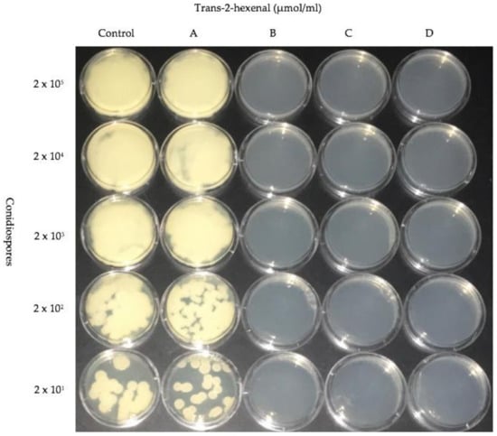 In the second exposure system designed to test trans-2-hexenal in amounts less than 0.05 µmol/mL, plates containing VOC treated spores were removed from VOC exposure and covered with sterile fresh covers. The plates were incubated for three more weeks at 10 °C. Three replicates were used per treatment and the experiments were repeated twice. When no growth was observed after three weeks, plates were incubated for another 12 weeks in the absence of VOCs in order to verify that the fungus was no longer viable (i.e., that the VOC exposure was fungicidal).