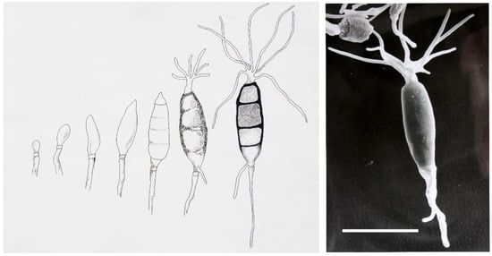 Development of the conidiospore of Seimatoanlerium tepuiense a novel endophyte discovered on a tepui in the Brazil, Venezuela, Guyana area of South America. The actual spore is shown to the right as a scanning electron micrograph. The bar is equivalent to 20 microns.