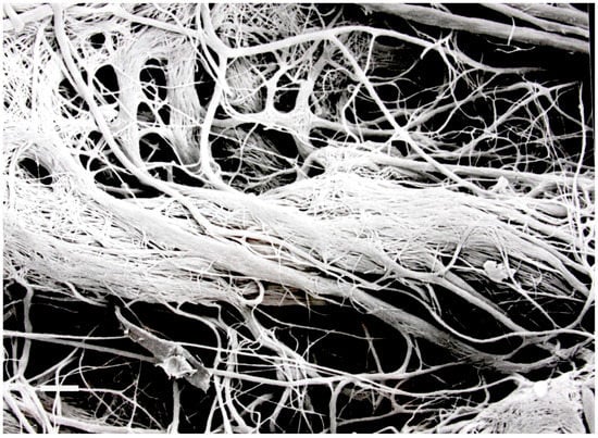The convoluted and interwoven hyphae of Muscodor albus, a volatile antibiotic producing fungus. The white bar is equivalent to 5 microns.
