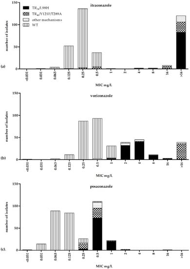The triazoles, itraconazole, posaconazole, and voriconazole, are antifungal agents with potent activity against Aspergillus fumigatus. Voriconazole is predominately used for the treatment of invasive aspergillosis, while posaconazole is used for prophylaxis against invasive fungal infections in patients with hematological diseases, and itraconazole is the first choice for patients with chronic pulmonary aspergillosis. The treatment of Aspergillus infections is complicated due to the increase in antifungal drug resistance in A. fumigatus in some geographical areas [,,]. Azole resistance in A. fumigatus is most frequently conferred by mutations in the cyp51A gene encoding 14α-sterol demethylases. TR34/L98H and TR46/Y121F/T289A are the two most common mutations associated with environmental resistance selection. Importantly, isolates with these environmental associated mutations can be recovered from azole-naïve patients as well as azole-treated patients [,,,]. Other common mutations such as those at residue M220 or G54 in the cyp51A gene were associated with long-term use of azoles in a clinical setting, especially in patients with chronic cavitary aspergillosis []. A recent retrospective cohort study showed a 21% increased mortality in patients with azole-resistant invasive aspergillosis compared to azole-susceptible infection []. Due to the increase in resistance and the fact that resistance can also be found in azole-naïve patients, susceptibility testing becomes increasingly clinically relevant for guidance of appropriate antifungal therapy [,]. Two reference guidelines are available for the susceptibility testing of A. fumigatus—broth microdilution based on the Clinical and Laboratory Standards Institute (CLSI) and the European Committee on Antimicrobial Susceptibility Testing (EUCAST) methods [,]. The minimal inhibitory concentration (MIC) distributions of an extensive number of wild-type (WT) and azole-resistant isolates were reported with the EUCAST method []. However, for the CLSI method, MIC distributions of a large collection of azole-resistant isolates are not available.
