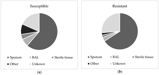 For 285 isolates, the sample origin was available, and the majority were isolated from sputum and bronchial aspirates. Ninety-three of the resistant isolates were cultured from sputum and bronchial aspirate, five were from bronchoalveolar lavage (BAL) samples, three were from sterile tissue biopsies, and for 37 resistant isolates, the origin is unknown. For susceptible isolates, a higher proportion was cultured from BAL or sterile tissues. The distributions are displayed in Figure 2.