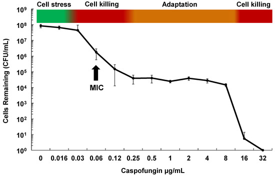 Phases of in vitro cell killing and adaptation with echinocandins and Candida glabrata. Cells (1×107) of C. glabrata ATCC 2001 were grown in RPMI medium containing caspofungin at the indicated concentrations for 20 h. Dilutions were then plated onto drug free agar-containing plates to determine surviving cell counts. Shown is the average of 4 independent experiments ± standard deviations. The minimum inhibitory concentration (MIC) is indicated for reference.