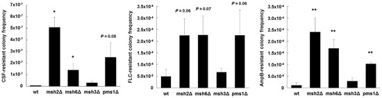 Echinocandin, azole, and polyene resistant colony frequencies of C. glabrata mismatch repair deletion strains. Strains were selected agar plates containing 1 µg/mL of caspofungin (CSF), 256 µg/mL of fluconazole (FLC), or 2 µg/mL of amphotericin B (AmpB) (panels left to right) (all concentrations 8-16x the corresponding MIC). Dilutions were plated onto drug-free media to determine exact CFU counts. Frequencies were calculated as the number of colonies on the drug plate divided by the total CFU plated. Frequency averages were calculated from at least three independent selections. * p < 0.05 and ** p < 0.01 (student’s t-test; two-tailed).
