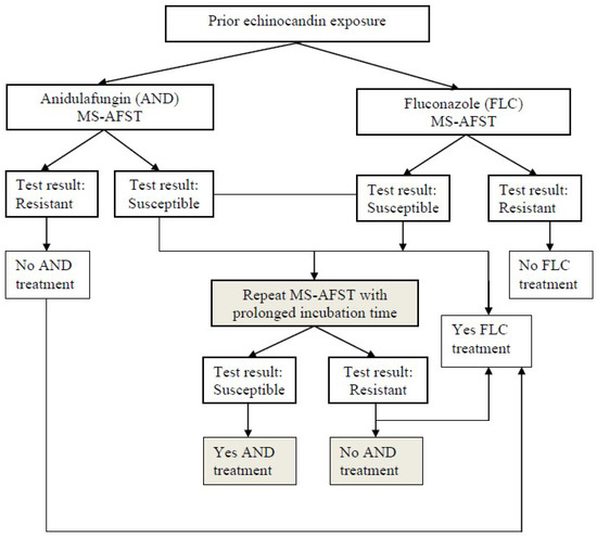 Concerning Candida, antifungal susceptibility is predictable if the infecting organism is identified to the species level, but individual isolates may not follow this course, thus requiring antifungal testing [9]. Importantly, the Infectious Diseases Society of America (IDSA) guidelines for the management of candidiasis recommend routinely performing AFST for C. glabrata against azoles and echinocandins [5]. The same guidelines mention that routine testing for Candida species other than C. glabrata has less value [5]. Nevertheless, we agree with the opinion by Ostrosky-Zeichner and Andes [9] that routinely testing antifungal susceptibility of all bloodstream and sterile site isolates of Candida species may be helpful to provide an index for susceptibility trends and the emergence of resistance locally and regionally. However, in a resource-restricted environment, AFST should focus on isolates from cases of treatment failure, breakthrough infection, or limited therapeutic options, which are consequences of underlying comorbidities, adverse events, or previous antifungal use [9]. Consistent with this, in a scenario of prior echinocandin exposure, Vella et al. [69] proposed that rapid detection of C. glabrata isolates as fluconazole-resistant by the MS-AFST assay could alert clinicians to the potential presence of anidulafungin resistance in these isolates (Figure 1). Despite representing a personal view of the utility of this approach (and not a recommendation), Figure 1 underlines that using anidulafungin as a surrogate marker would lead to a scenario in which, if no resistance is detected, either of the three echinocandins (not only anidulafungin) could be administered.