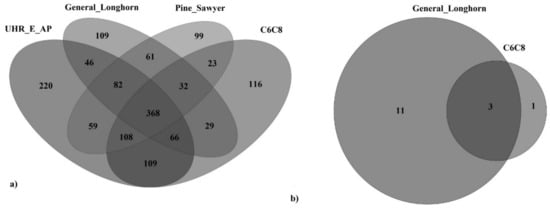 A total of 1,527 species remained once the species detected in the negative control were discarded, of which 368 species (approximately 25%) were common to all semiochemical types, 220 species (approximately 14%) were unique to the UHR_E_AP, 109 (7.1%) were unique to the General Longhorn, 99 (6.5%) were unique to the Pine Sawyer, and 116 (7.6%) were unique to the C6C8 lure (Figure 1a). Following the approach of Tedersoo et al. [] to investigate fungal species functions, the data revealed the occurrence of some species of moderate concern, in each of the semiochemical treatments (Table S3). In the Pine-Sawyer-baited samples, three rot fungi and six phytopathogenic fungi (including, Ambrosiella ferruginea, Leptographium sp., and the Phaeoacremonium inflatipes) were detected. From the General Longhorn samples, five rot fungi and eight phytopathogenic causal agents, including Echinodontium tinctorium, Siroccocus conigenus, and Pucciniastrum circaeae were detected. The C6C8 semiochemical treatment featured some unique fungi of interest as well—a single white rot, the yeast Candida michaelii, which is associated with the gut flora of the handsome fungus beetles (Endomychidae), and eight phytopathogens, including Phyllosticta minima, Podosphaera clandestina, and Ciborinia Whetzelii. Finally, the UHR_E_AP semiochemical had six rots, along with thirteen pathogenic fungi, namely the Colletotrichum fructi, C. nymphaeae, Devriesia streliziicola, Erysiphe convolvuli, E. diffusa, Mollisia dextrinospora, Neoerysiphe galeopsidis, Podosphaera leucotricha, P. lini, Septoria gladioli, Stragonospora pseudopaludosa, Strelitziana mali and the Teratosphaeria xenocryptica. The fungal sequence data obtained prior to species subtraction, including the rarefaction curves, can be found in Supplementary Information S2 and Table S4.