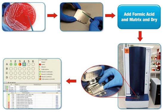 - Lacroix, C.; Gicquel, A.; Sendid, B.; Meyer, J.; Accoceberry, I.; Francois, N.; Morio, F.; Desoubeaux, G.; Chandenier, J.; Kauffmann-Lacroix, C.; et al. Evaluation of two matrix-assisted laser desorption ionization-time of flight mass spectrometry (MALDI-TOF MS) systems for the identification of Candida species. Clin. Microbiol. Infect. 2014, 20, 153–158. [Google Scholar] [CrossRef]