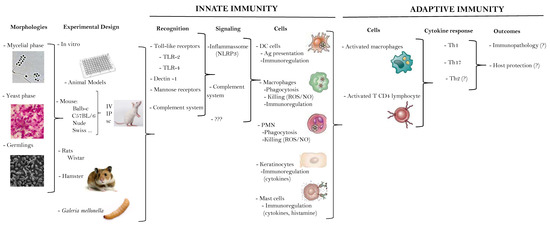 Current available data on the immune response to Sporothrix spp. (or their components) is predominantly based on in vitro studies and in rodent experimental models, reprising the strategies used in the investigation of the immune reactivity of the other, better studied, endemic deep or subcutaneous mycoses; data gathered directly from human patients is scarce. While those studies differ widely in the species tested, the fungal phase used to infect or to obtain fungal components (conidia vs. yeast vs. germlings), the size and route of inoculation (mostly intraperitoneal and intravenous) and animal models employed (mouse strains, Wistar rats, golden hamster and, more recently, the great wax moth Galleria mellonella), the extent to which they contribute to the understanding of the immunopathogenesis of the human disease is still not clear since the pieces do not fit the puzzle. Only recently, mouse models mimicking the human disease (i.e., subcutaneous inoculation) have been explored [29,30,31,32].