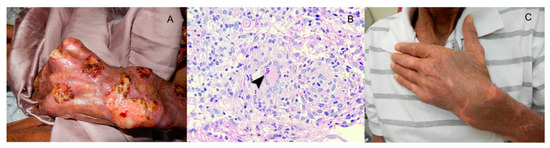 - Yamaguchi, T.; Ito, S.; Takano, Y.; Umeda, N.; Goto, M.; Horikoshi, M.; Hayashi, T.; Goto, D.; Matsumoto, I.; Sumida, T. A case of disseminated sporotrichosis treated with prednisolone, immunosuppressants, and tocilizumab under the diagnosis of rheumatoid arthritis. Intern. Med. 2012, 51, 2035–2039. [Google Scholar] [CrossRef]