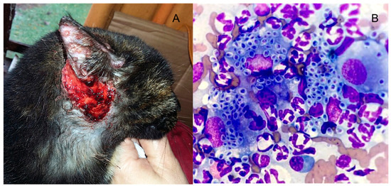 Ulcerated and papular vesicular lesions in the head and ear of a cat with proved Sporothrix brasiliensis infection (A). Cutaneous feline lesions are highly infective and harbor a great number of yeast cells of the fungus. Feline sporotrichosis can be easily diagnosed by secretion direct exam stained Giemsa × 1000 (B).