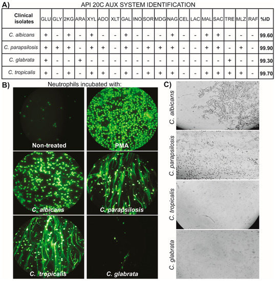 We also analyzed the morphology of each of our isolates. Only C. albicans was able to form filamentous structures; in contrast, neither C. glabrata, nor C. parapsilosis, nor C. tropicalis could form these structures (Figure 1C).