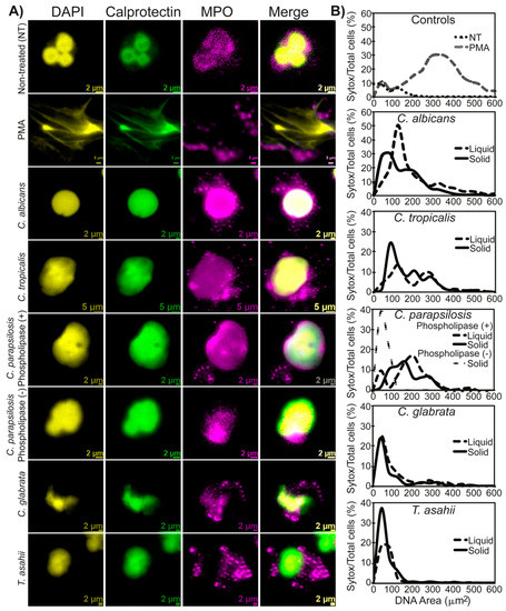 Nuclear changes and granule migration reminiscent of NETs occurred in neutrophils after treatment with C. albicans, C. tropicalis, and C. parapsilosis phospholipase positive, but not after incubation with C. glabrata or C. parapsilosis phospholipase negative strains. (A) Immunofluorescence microscopy images of neutrophils stained with myeloperoxidase (MPO) and calprotectin after treatment with PMA (positive control), non-treated (NT) or treated with C. albicans, C. tropicalis, C. glabrata, or with strains of C. parapsilosis producers of phospholipase or with phospholipase negative strains. In addition, for comparative purposes, neutrophils were incubated with a phospholipase negative strain of Trichosporon asahii for 180 min. To assess the nuclear morphology, the nucleus was stained with DAPI. From left to right, columns correspond to DAPI, calprotectin, MPO, and a merged image. (B) Nuclear area quantification of non-treated (NT) neutrophils or incubated with C. albicans, C. parapsilosis, C. tropicalis, C. glabrata, and Trichosporon asahii isolates grown on solid or liquid medium or PMA alone as a positive control. Additionally, a nuclear area quantification of neutrophils incubated with phospholipase-producing C. parapsilosis (+) or with a negative phospholipase strain (–) is shown. The nuclear area of neutrophils after stimulation was calculated as indicated in the Materials and Methods section, and the value corresponding to a given nuclear area range was plotted against the percentage of Sytox positive cells. Results are representative of three independent experiments and each condition was tested in triplicate.