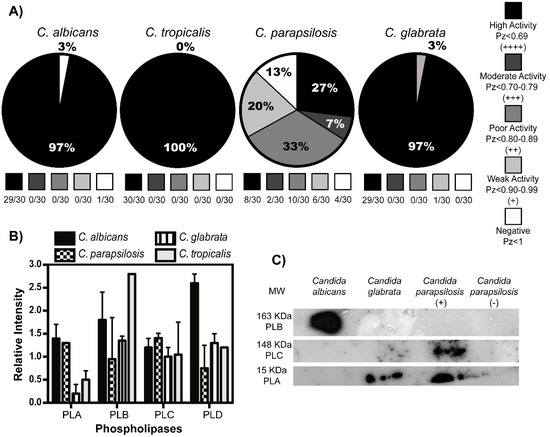Phospholipases identification showed that the four subtypes (A, B, C, and D) are produced in the yeasts of all species (Figure 3B); however, the analysis of the secreted phospholipases demonstrated some differences. C. albicans secreted phospholipase B, whereas phospholipase-producing strains of C. parapsilosis showed secretion of mainly phospholipase A and C, in addition, C. glabrata species secreted low levels of phospholipase A. On the other hand, and as was expected, there was no secretion of phospholipases in phospholipase-negative strains of C. parapsilosis (Figure 3C).