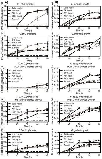 Of importance for our study is that all the strains used are blood isolates from systemic infections, because of this we were interested in studying if the environment in which the fungus is grown could influence the expression of these enzymes. To analyze this, we carried out experiments in which each strain was grown in liquid or solid medium for 24, 72, or 96 h. We observed that phospholipase activity of C. albicans was mostly not affected, and some differences could only be observed in older cultures in which after an initial delay in liquid medium, they reached the same enzymatic activity as the strains grown on solid medium. Conversely, older C. tropicalis strains grown in liquid increased their phospholipase activity, remaining higher than in solid medium. For C. parapsilosis, the strains with poor phospholipase activity did not show any difference in activity at any time point, regardless the medium in which they were grown; on the contrary, the strains with high phospholipase activity demonstrated a higher enzymatic activity when they were grown on liquid medium than those grown on solid medium. For C. glabrata strains, no differences were observed in activity at any time point (Figure 4A and Supplementary Table S1). As a negative control, a Trichosporon asahii strain was used and as expected, we did not observe enzymatic activity at any time. An explanation for these results could be that the liquid medium increases the growth rate of the strains. To analyze this, we determined the fungi growth in each condition: interestingly, the growth of all Candida spp. strains was greater in solid medium than in liquid medium (Figure 4B and Supplementary Table S1).