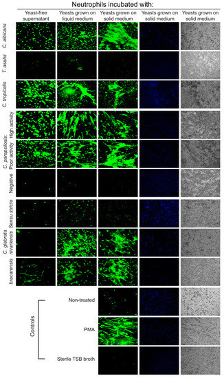 - Urban, C.F.; Reichard, U.; Brinkmann, V.; Zychlinsky, A. Neutrophil extracellular traps capture and kill candida albicans yeast and hyphal forms. Cell. Microbiol. 2006, 8, 668–676. [Google Scholar] [CrossRef] [PubMed]