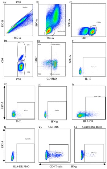 Flow cytometry gating strategy for T cells. Multiparameter flow cytometry was used to identify the frequency, phenotype, and post-stimulation cytokine expression of CD4+ and CD8+ T cells within total peripheral blood mononuclear cells of patients with and without CM-IRIS at baseline and at the CM-IRIS event. Representative staining shows the analytic gating strategy: (A) FSC-H/FSC-A showing the singlet gate; (B) FSC/SSC for lymphocytes selected from singlet gate; (C) T cells expressing CD3 were selected; (D) CD3+ cells expressing CD4 and CD8 were then identified; (E) gating by differential expression of CD27 and CD45RO identified naïve and memory T cells subsets with naive T cells as (CD27+CD45RO−); central memory as (CD27+CD45RO+), effector memory as (CD27−CD45RO+), and terminally differentiated effector memory as (CD27−CD45RO−); (F) CD4+ expression of IL-17 (unstimulated); (G) representative example of IL-2 expression by CD4+ T cells (unstimulated); (H) representative example of IFN-γ expression by CD4+ T cells (unstimulated); (I) representative example of HLA-DR expression by CD4+ T cells and; (J) HLA-DR Fluorescence minus one gating; (K) representative example of IFN-γ expression by CD4+ T cells in a subject with CM-IRIS and; (L) IFN-γ expression by CD4+ T cells in a control subject without CM-IRIS.