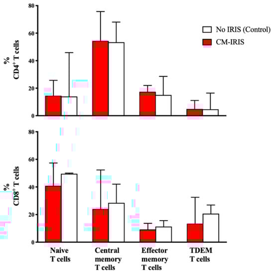 Frequencies of CD4+ and CD8+ memory T cell subsets at the time of initial cryptococcal meningitis diagnosis among ART-naïve subjects who later developed CM-IRIS vs. controls without IRIS. CD4+ Central memory and CD8+ naïve T cells predominated without significant differences between groups. Bars represent median values and error bars show interquartile ranges. Abbreviations: TDEM- terminally differentiated effector memory. White bars represent CM diagnosis, red bars represent CM-IRIS.