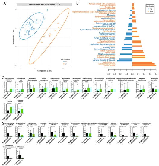 Multivariate sparse partial least square discriminant analysis (sPLS-DA) to identify baseline variables that are able to differentiate subjects that later developed oral candidiasis during chemotherapy (n = 9) from those that remained candidiasis-free (n = 36). (A) Separation of subjects that tested positive and negative for oral candidiasis, according to the sPLS-DA model. (B) Variables with their loadings contributing to component 1, which best separated subjects based on an oral candidiasis diagnosis. All baseline variables measured were taken into account in the analysis, including demographic, medical, oral-health, and neutrophil characteristics, bacterial and Candida burdens, microbiome diversity, and the proportions of microbiome taxa present in at least 10% of subjects. (C) The baseline proportions of bacterial (1st row) and fungal (2nd row) taxa, identified in the sPLS-DA model as ‘increased’ in subjects that later developed oral candidiasis. (D) The baseline proportions of bacterial (1st row) and fungal (2nd row) taxa, identified by the sPLS-DA model as ‘increased’ in the unaffected subjects. p values (unadjusted) shown in C and D are those that were significant after comparing the proportions via Mann–Whitney rank tests.