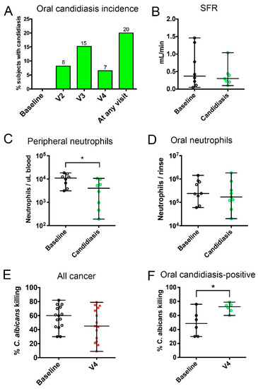 Incidence of oral candidiasis during one chemotherapy cycle and associated changes in salivary flow and neutrophil surveillance. (A) Oral candidiasis incidence. (B–D) Changes in salivary flow rate, peripheral neutrophil counts, and oral neutrophil counts between baseline and the first visit with candidiasis. (E,F) Changes between baseline and V4 in the ability of peripheral neutrophils to kill C. albicans in all cancer subjects and in subjects that tested positive for oral candidiasis, during the cycle. * indicates a p value < 0.05, when comparing subject-matched data via Wilcoxon Rank tests.