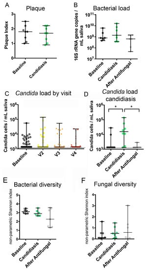 Changes in the bacterial and fungal burdens and community diversity during the development of oral candidiasis. (A) Changes in Plaque Index between baseline and the first visit with candidiasis. (B) Changes in salivary bacterial load as subjects developed oral candidiasis and after antifungal treatment. (C) Changes in salivary Candida load in all subjects, during the chemotherapy cycle. (D–F) Changes in Candida load, bacteriome diversity, and mycobiome diversity, as subjects developed oral candidiasis and after antifungal treatment. *indicates a p value < 0.05, when comparing subject-matched data via Wilcoxon Rank tests.