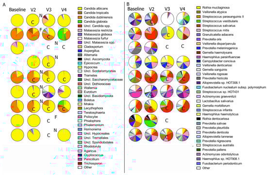 Longitudinal characterization of the oral microbiome during oral candidiasis development and after antifungal use. Salivary mycobiome (A) and bacteriome (B) composition of individual samples, in subjects that developed oral candidiasis during chemotherapy. The pie charts show the relative proportions of fungal taxa or bacterial species. C = oral candidiasis; N = Nystatin intake; F = Fluconazole intake. Only taxa present at a relative abundance of at least 1% (for fungi) and 5% (for bacteria) in one sample are depicted individually in the pie charts. “Other” indicates the aggregated counts of taxa not individually depicted.