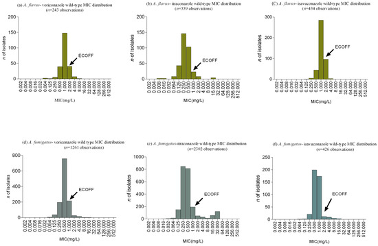 103. Pfaller, M.; Boyken, L.; Hollis, R.; Kroeger, J.; Messer, S.; Tendolkar, S.; Diekema, D. Use of epidemiological cutoff values to examine 9-Year trends in susceptibility of Aspergillus Species to the triazoles. J. Clin. Microbiol. 2011, 49, 586–590. [Google Scholar] [CrossRef] [PubMed]