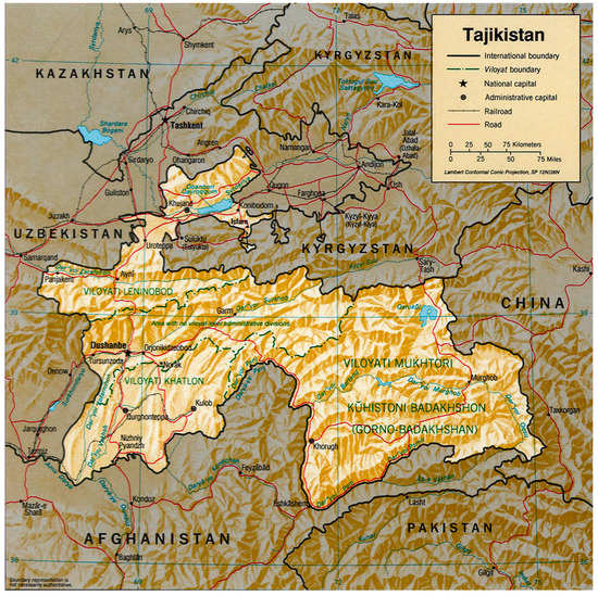 - Detailed Map of Tajikistan. Available online: https://commons.wikimedia.org/wiki/File:Tajikistan_2001_CIA_map.jpg#filelinks (accessed on 25 June 2019).