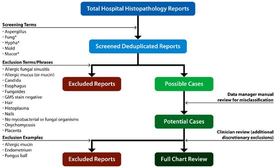 One strategy to identify infections from pathologic records is to use an algorithm to search the free text of histopathology reports (Figure 1). Real-time case finding can be conducted in collaboration with pathologists, who can remain watchful for evidence of tissue invasion and angioinvasion and notify investigators as it is identified. One limitation of this approach is that pathology reports rarely include mucormycete species; often they report only that hyphae or fungal elements were observed. Key terms, such as broad, ribbon-like, aseptate or pauciseptate, can be useful.