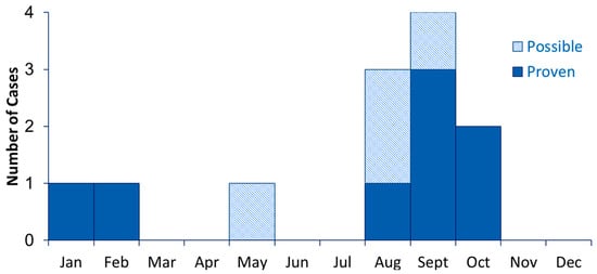 Sample epidemic curve, showing the number of proven and possible cases by month.