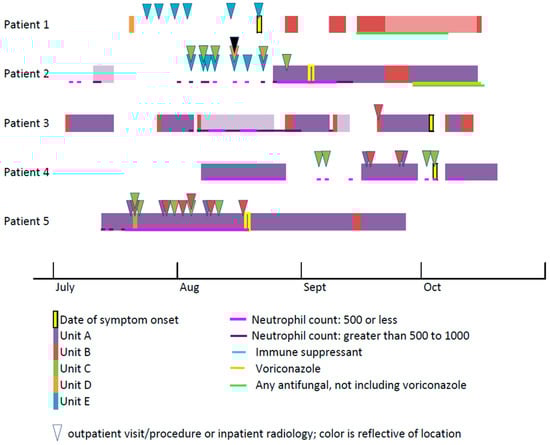 Sample timeline of inpatient locations and outpatient visits. Each of the five lines represents a different patient. Outpatient visits are depicted with a triangle color-coded by location. Days in each inpatient unit are depicted by color-coded bars. The lines under the bars show days the patient was immunosuppressed and received antifungal medication.
