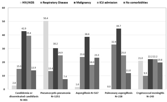 The proportion of selected patient groups among patients with potentially life threating fungal diseases, Taiwan, 2013. The group “Aspergillosis” included the diagnosis code 117.3 and 484.6; the group “Pulmonary aspergillosis” included the diagnosis code 484.6. The subgroup “No comorbidities” includes patients without underlying diseases listed in Charlson comorbidities [11]. Abbreviations: AIDS, acquired immune deficiency syndrome; HIV, human immunodeficiency virus; ICU, intensive care unit.
