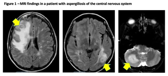 - Gonzales Zamora, J.A.; Henry, Z.; Gultekin, S.H. Central Nervous System Aspergillosis: An Unexpected Complication following Neurosurgery. Diseases 2018, 6, 46. [Google Scholar] [CrossRef]