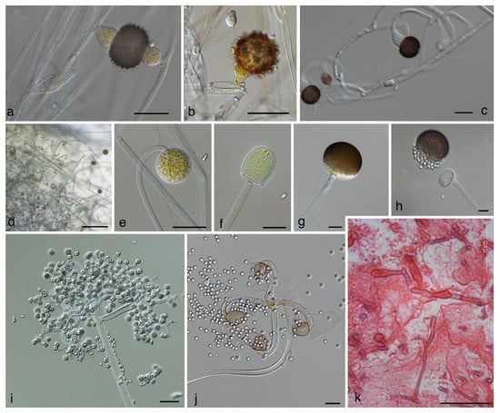 Morphology of the Mucorales. (a) Zygospore with equal suspensors of Mucor endophyticus CBS 385.95; (b) azygospore of Mucor bainieri CBS 293.63; (c) zygospores with unequal suspensors of Mucor multiplex (syn. Zygorhynchus multiplex) CBS 110662; (d) top view on a young mycelium with transitorily recurved sporangiophores; (e) recurved sporangiophore and (f) columella of Backusella recurva CBS 318.52; (g) sporangium with circumscissile zone of dehiscence and (h) discharged sporangium of Pilaira anomla CBS 699.71; (i) sporangiola-bearing complex sporophore of Thamnidium elegans CBS 341.55; (j) circinate sporangiophore branches with columellae and detached sporangiospores of Circinella umbellata; (k) hyphae of Rhizopus microsporus in human lung tissue. Scale bars = 50 µm except of d = 500 µm.